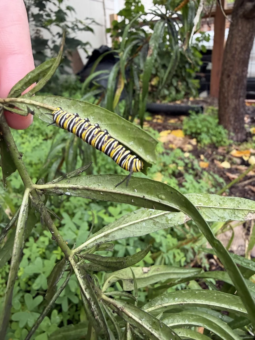 Here is an example of why we leave the milkweed even though it looks a bit funky, I found 4 monarch caterpillars feasting away on the milkweed fattening up before they chrysalis. yay! My daughter and I were so excited to find them happy and munching away. They didn’t care about the aphids and are happy to eat all the leaves!