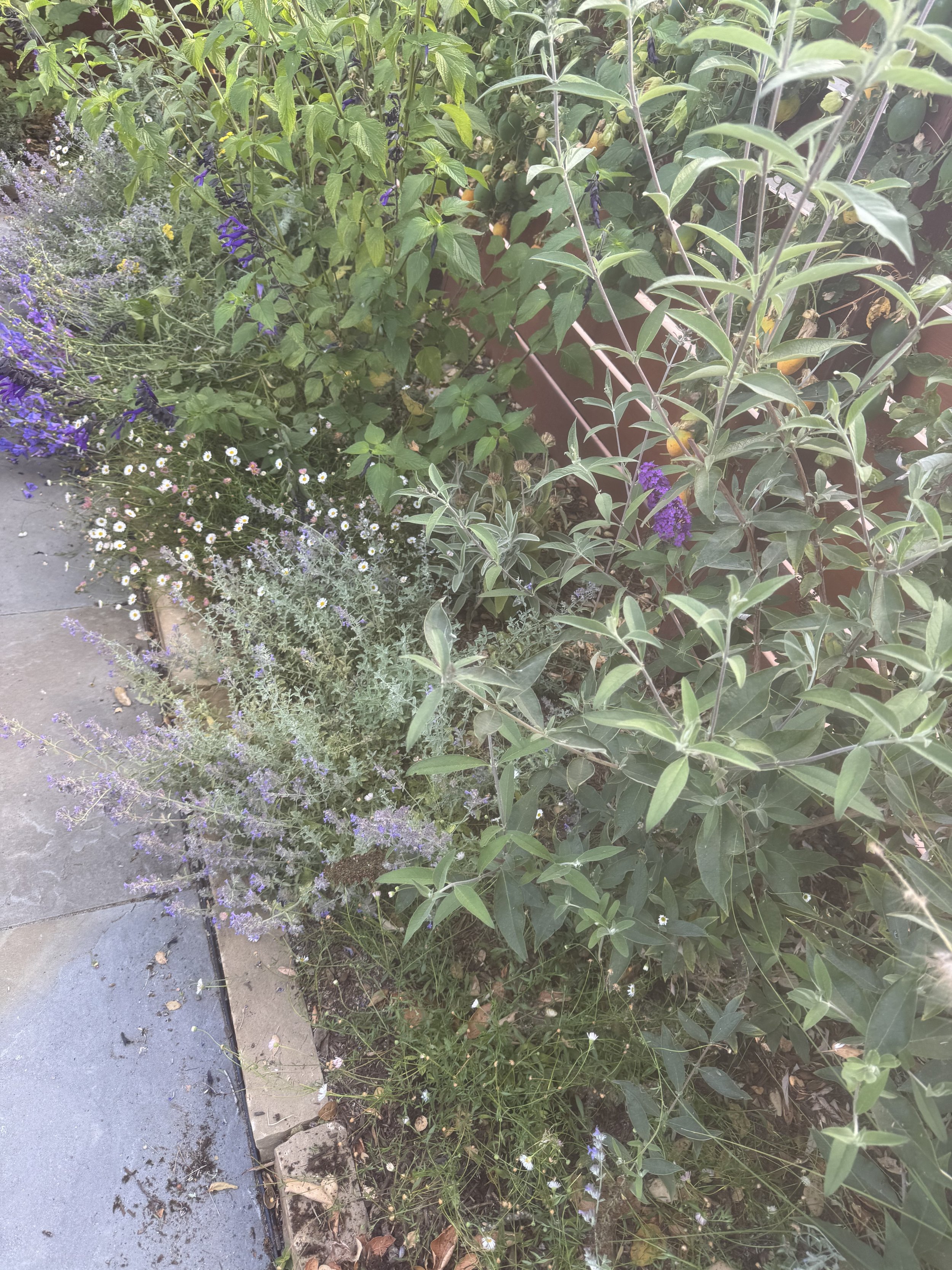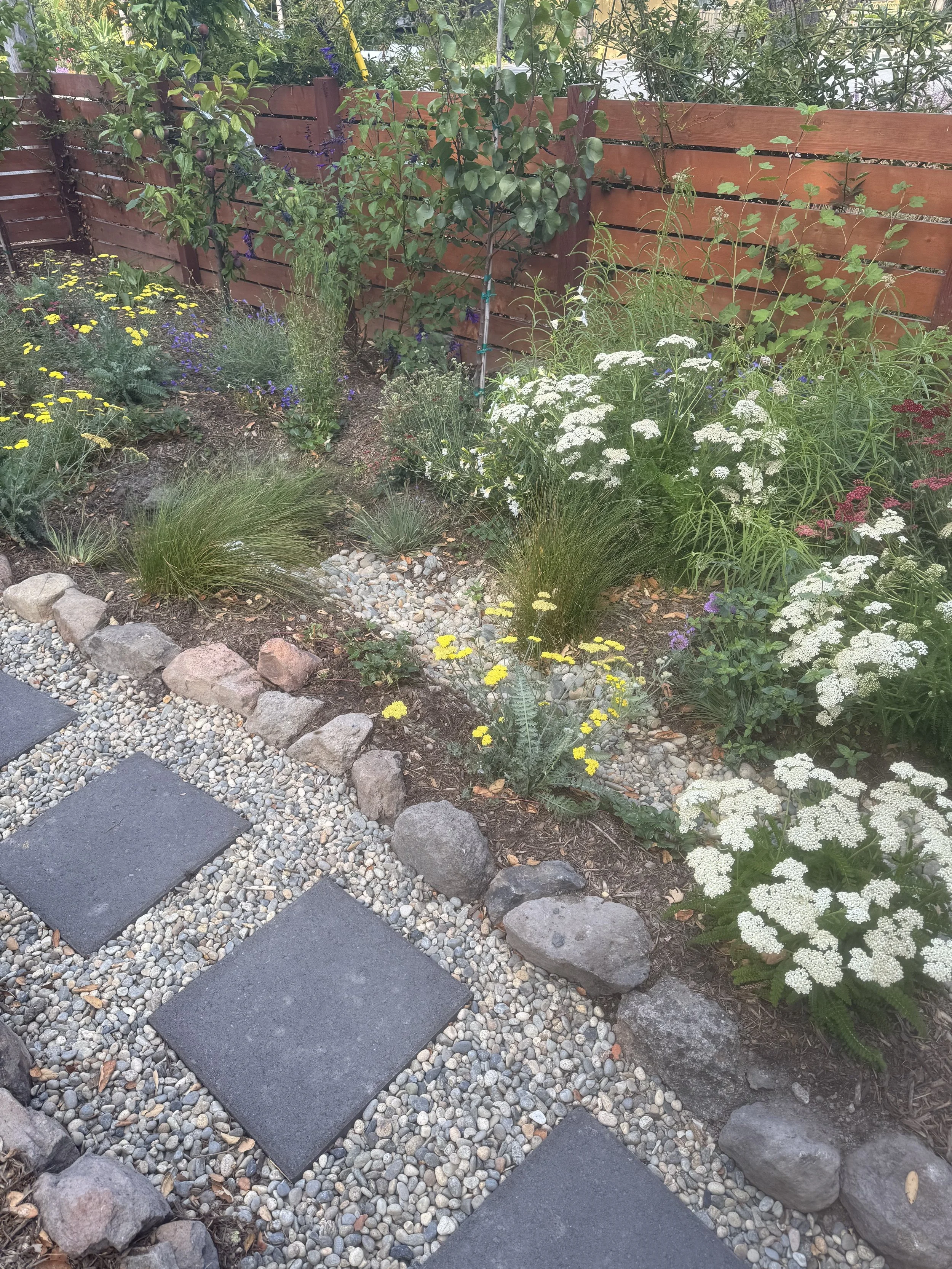 This was a huge blank canvas to work with another one under the canopy of the oaks. We added so many pollinators and fruit trees. We even collected all the rain water from three downspouts and created a rain garden that will be working hard to fill up the ground water stores from the rainy season!