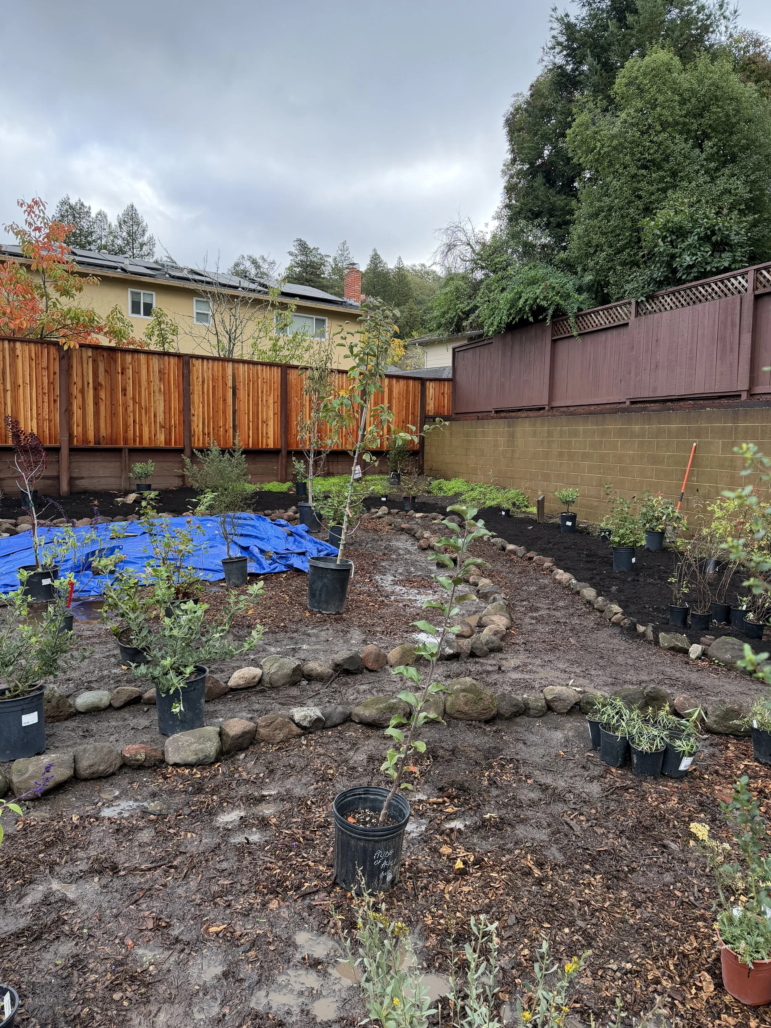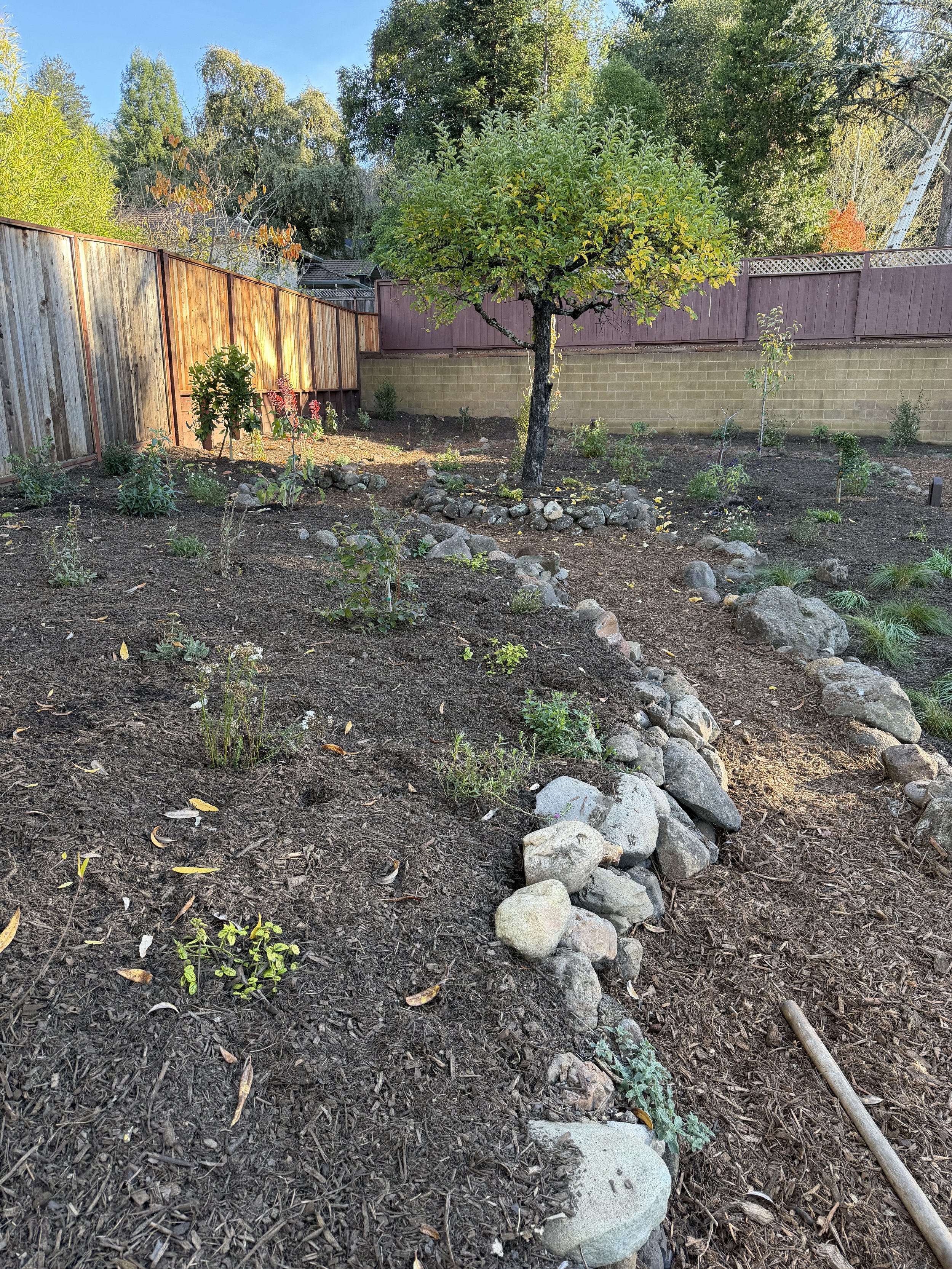 These clients had recently purchased a home so they could build a backyard fruit orchard and pollinator garden. It was a beautiful blank slate. We added 13 fruit trees and 6 blueberry plants! In addition to so many native pollinators! This space will bring a bounty of fruit and flowers!